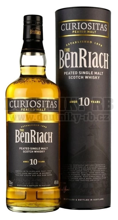 Benriach Curiositas Peated Malt je silně rašelinová single malt whisky. Aroma se projevuje silným rašelinným kouřem, k tomu je v pozadí cítit ovoce, vřes a vonné tóny medu s přítomností dubového dřeva.