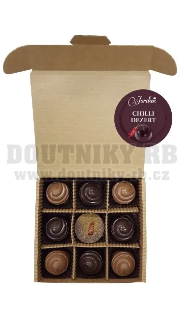 Mix chilli náplně v hořké a mléčné čokoládě doplněný čokoládovými placičkami s posypem chilli - žhavé pochutnání