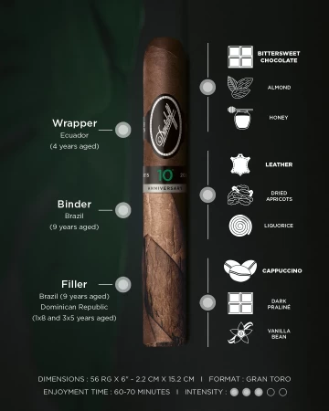 Doutník Davidoff Escurio 10th Anniversary má lahodnou krémovou chuť s tóny vanilky, zeminy, sušených meruněk, kůže, medu a a mandlí.