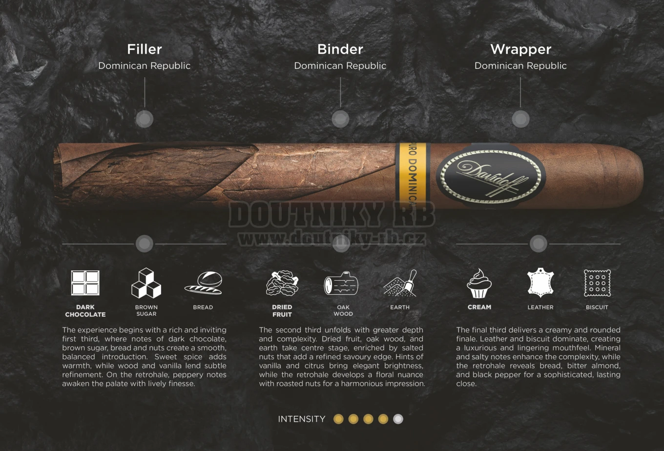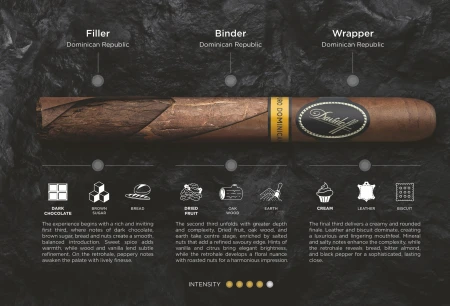 Davidoff Puro Dominicano je tzv. full bodied cigar, tedy doutník plné chuti a přináší zemité tóny koření a dřeva.