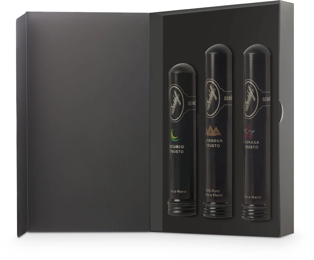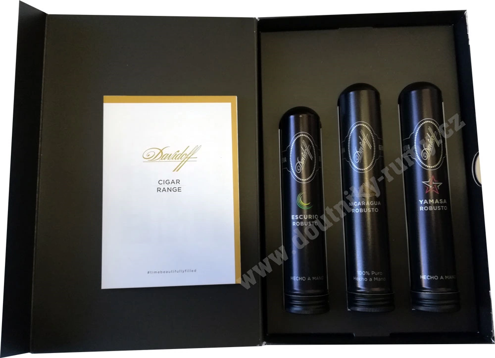 Výběr 3 doutníků Davidoff Robusto Tubos jsou elegantně vloženy v dárkové papírové krabičce černé barvy, která vyznačuje jedinečnou kvalitu a popis doutníků Davidoff.