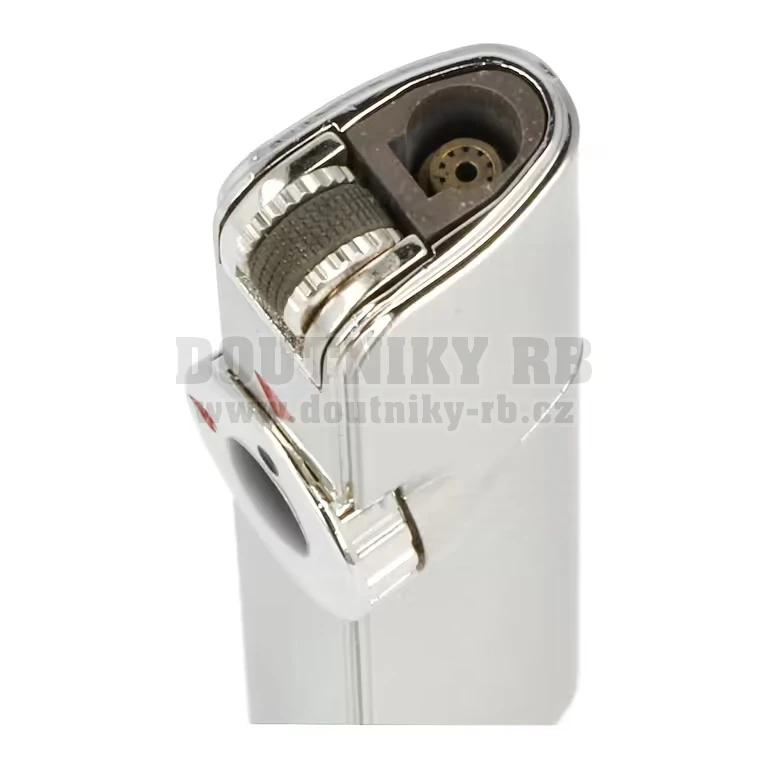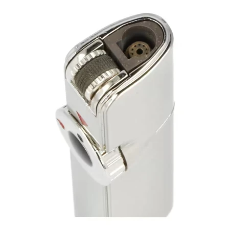 Kovový zapalovač má na čelní straně umístěný kulatý ovladač, kterým ovládáme zapnutí a vypnutí plynu.
