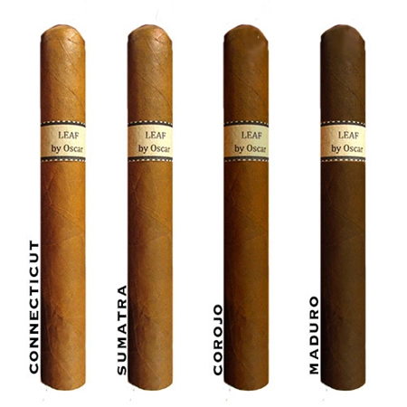 Vzorník doutníků Leaf by Oscar Vám nabízí 4 doutníky různých krycí listů (Connecticut, Sumatra, Corojo, Maduro) této série ve velikosti Toro v krásné dřevěné krabičce.