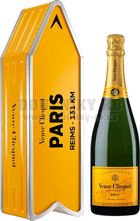 Láhev champagne Veuve Clicquot Brut v plechovém dárkovém balení arrow (směrová šipka) směr Paris.