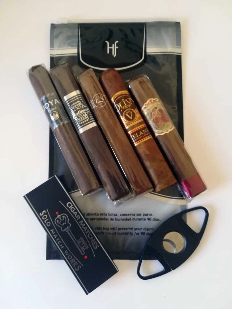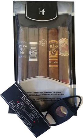 Plastový ořezávač doutníků a doutníkové zápalky jsou součástí výběru/setu.